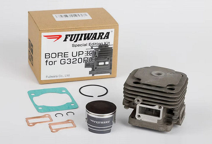 Full mod Fujiwara 38cc bore up kit for the Zenoah G320RC engine. A +2mm stroke is needed for this top end.